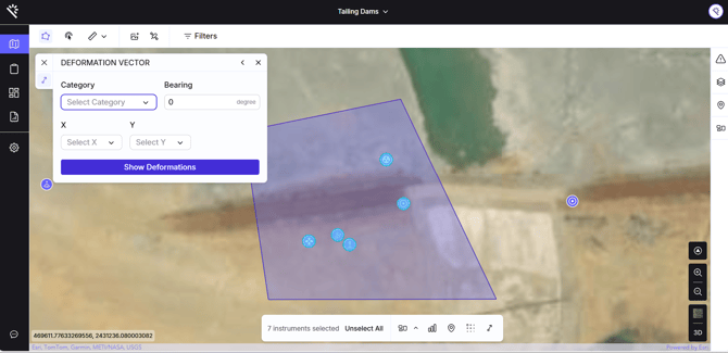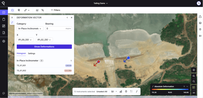 Proqio´s displacement vector feature enables users to clearly visualize both the magnitude (how much movement occurred) and the direction (in which way the ground or structure is shifting) of the changes in position that have been recorded by the sensors in a given project.